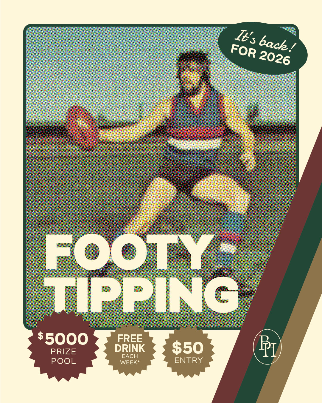 Footy’s better with bragging rights. Lock in your tips, climb the ladder, and make The Bay your weekly home base. One entry fee gets you in for the season and you’ll score a free drink each week* while you’re at it.