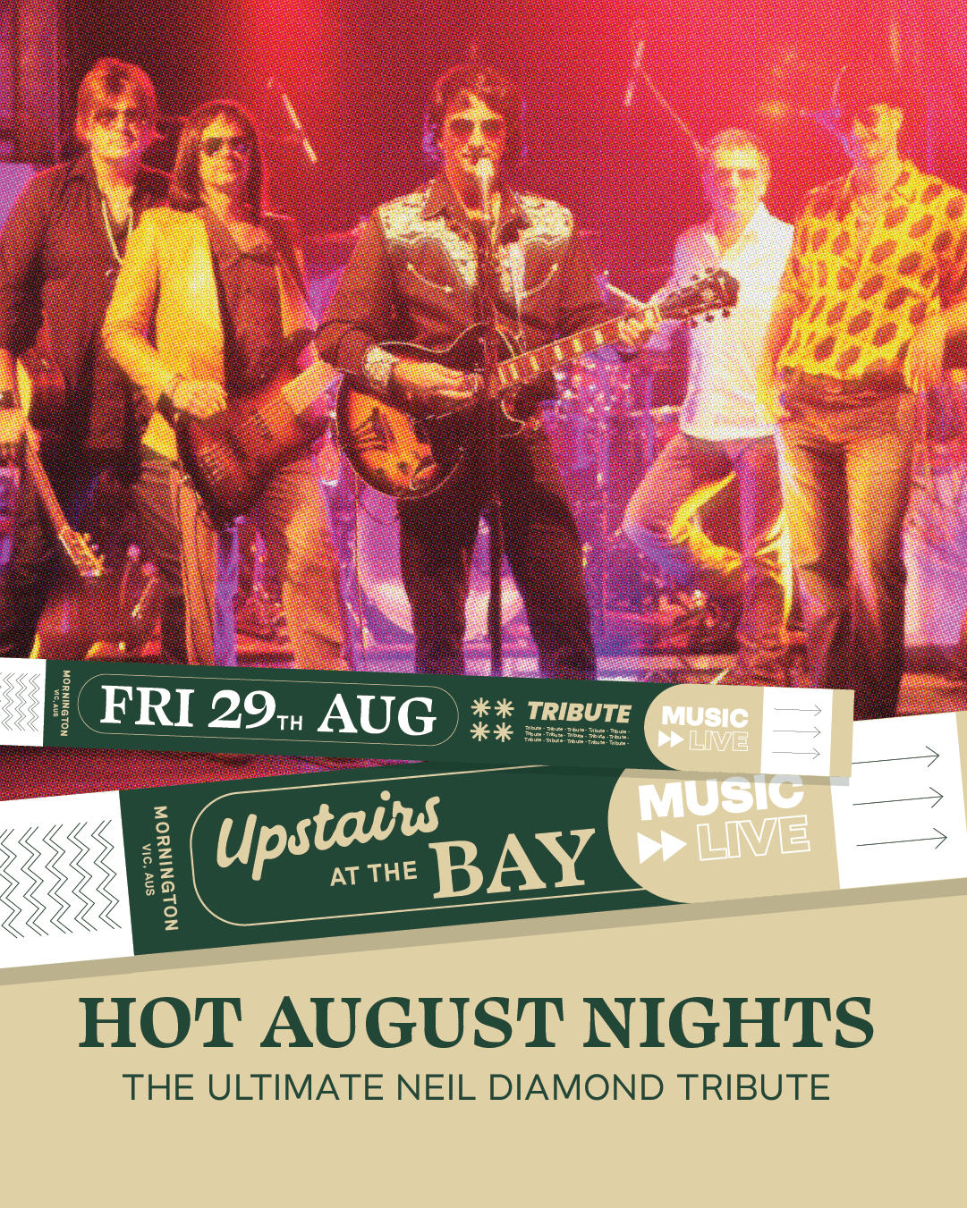 Join us upstairs at The Bay for Hot August Night, Melbourne’s premier Neil Diamond tribute band. This five-piece group of exceptional musicians and vocalists has been performing together for over 20 years, delivering unforgettable shows across the country.
